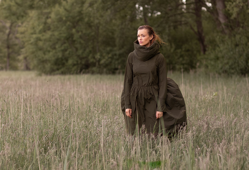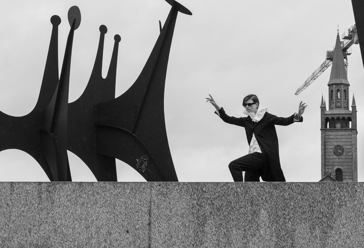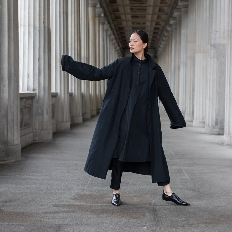 Extravagant im PIERROT-Style. Der lange, Statement-Mantel in NIGHT, über der PIERROT-Bluse mit ihrem überbordenden Rüschenkragen in MARINE, ergibt zusammen einen aufregenden Look. Inszeniert im klassizistischen Säulengang der Alten Nationalgalerie entfaltet das Ensemble eine besondere Magie.