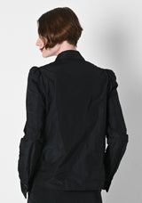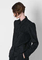 Eine feminine, schmale Bluse - charmant und verspielt. Leicht angekrauste Ärmel stehen im Gegensatz zu Manschetten und kleinem Kragen.