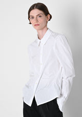 Eine feminine, schmale Bluse - charmant und verspielt. Leicht angekrauste Ärmel stehen im Gegensatz zu Manschetten und kleinem Kragen.